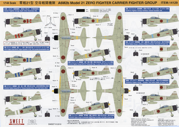 Instructions consist of a single folded sheet with a four step construction sequence on one side and a full color decal placement guide on the other. Painting info is given though unreadable by me. The interior seems to be in a green color with the upper fuselage inside the canopy, the main gear legs, and the engine cowling in black. Markings are provided for 8 different aircraft from 7 different aircraft carriers. These cover a variety of campaigns including Pearl Harbor, Santa Cruz, Aleutians, Darwin and a cople home based prior to deployment. I usually show the decal sheet, but thought you'd be interested in the markings placement guide for this one. The decals are superb and there are enough insignia and common markings for two planes. Note that Sweet has combined two kits for this one. One kit is the fighter group kit and the other is part of the flight deck kit.