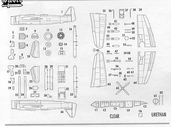 Molded on two grey and one clear sprue, this Sword kit is minimalist in terms of resin. A small sprue contains wing cannon and the DF antenna. I did have one part broken in shipping and that was a prop blade, thanks to being on the end of the sprue. Obviously, the sprue engineer did not take into consideration that having the blades sticking out and unprotected would be easy targets for breakage.