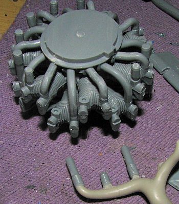 When I started on the engine, I realized that not much will actually be see once the cowling is on it. I could have fudged it by leaving off bits, but figured that building it up would be the best way to do a proper kit review. When I first dry fit the engine halves, I found that they didn't fit all the way so the receptacle and the large tab had to be trimmed. This still left me with a bit of a gap, but the idea of cleaning up all those cylinder fins wasn't appealing so I just left it as one will not see the side of the engine. There was a bit of flash that had to be taken care of in the areas where the pushrods would fit.