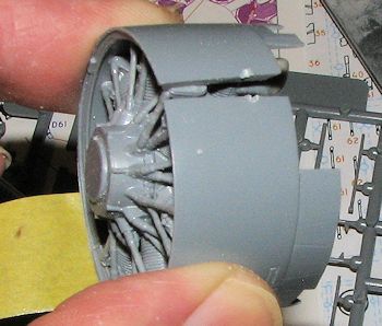 cowling halves from the sprues and taped one side. I then fit the engine into