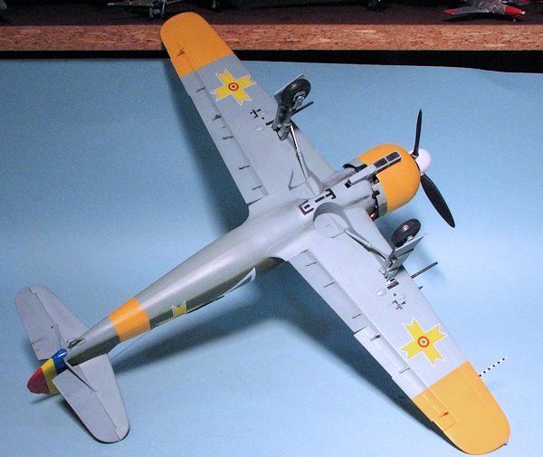 Unlike the earlier IAR-80s, these planes were in a pretty simple scheme of green uppers and light blue undersides. I first painted the lower wing tips and rear fuselage with white and then used some RLM 04 yellow. These areas were masked and the undersides were painted RLM 76. I also painted the inside and outside of the gear doors this color after assembling the small braces to the inside of them. For the upper surface, the instructions recommended RLM 83 so I used some Agama RLM 83 enamels for this. The RLM 83 took an age to dry, generally four to five days before it was no longer tacky to the touch. Eventually, it was all painted and so I gave the airframe a coating of clear gloss acrylic in preparation for the decals.