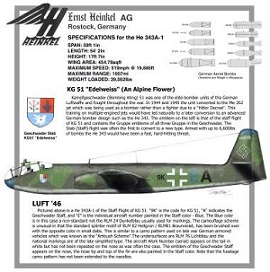 Some of the types represented are the Ta-183, He-343, Do-335 and Junkers EF 128. There is a full page for each week's planning. Dates of interest during WWII are included such as First USAAF victory over the Luftwaffe, First successful flight of a British Jet, and JG 1's transition to the He-162 are a few examples.