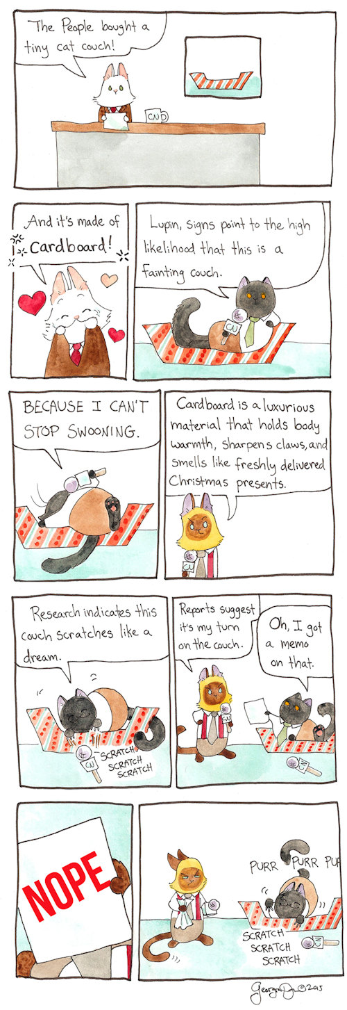 The strip is written by Georgia Dunn, whom, unlike many cartoonists, actually responds to posts by readers. She and her husband are owned by three shelter cats, one of which is missing a rear leg. These three cats feature prominently in the strip and each has his own distinct personality. The humans in the strip are 'the people' and are really just secondary to most of the adventures. The headlines include 'The house is under attack by a mysterious red dot", "There is a moth outside the window', 'The woman has a frosted cupcake. We now go live to the scene', The trees are falling apart', and 'A june bug got into the house', just to name a few.