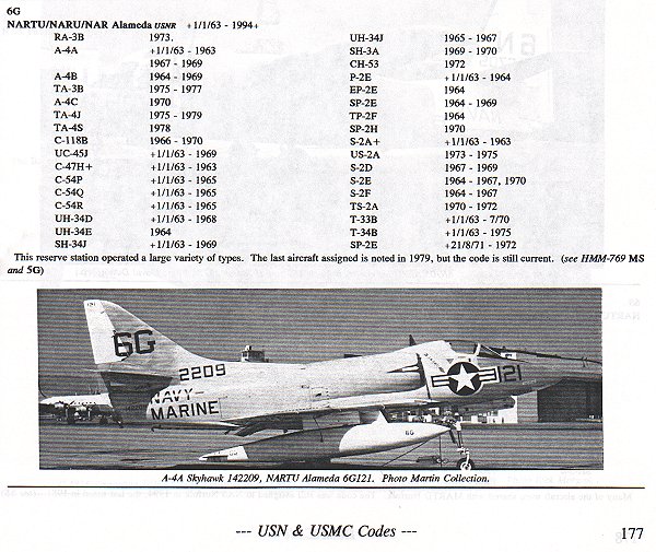 The main body of the book is broken down into three basic sections. First is a listing by tail code. There are two subsections to this; by letter-letter section (ie AB) , then number-letter (ie 6G (See closeup below)), finally a section by unit. All sections detail which aircraft types were flown during what period of time. The unit section does this plus shows the changing tail codes as air wings are changed.