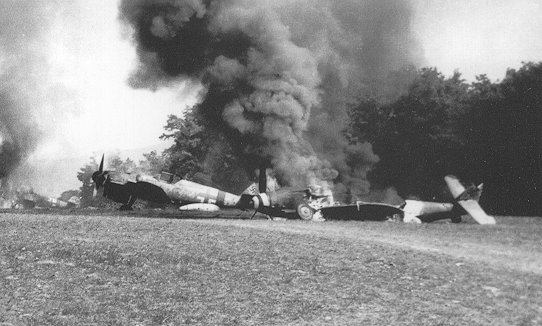 as the aftermath of an Allied air raid shown above and to the left.
