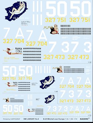 Aircraft on the sheet are two planes from the 321st BG and one from the 340 BG. One of the 321 BG options provides earlier tail markings. All three decal options are olive drab over unpainted metal and without the side gun packs.