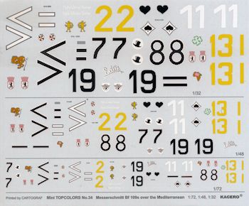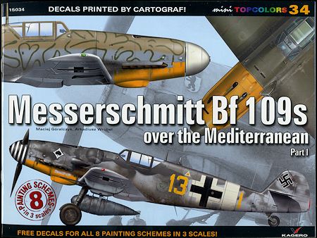This is #34 in their mini Top Colors series and covers eight aircraft, all Bf-109s of different variants. Like earlier books in the series, it is a bit difficult to categorize. Is it a book with a huge decal sheet or a huge decal sheet that has the world's largest color and markings guide? The sheet offers only the unique markings for each subject as the modeler can use the kit sheet for the common stuff.