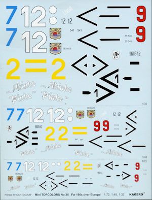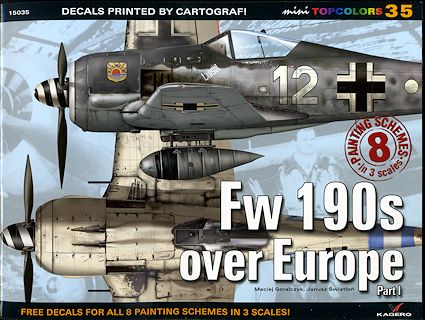 This is #35 in their mini Top Colors series and covers eight aircraft, all FW-190s of different variants. Like earlier books in the series, it is a bit difficult to categorize. Is it a book with a huge decal sheet or a huge decal sheet that has the world's largest color and markings guide? The sheet offers only the unique markings for each subject as the modeler can use the kit sheet for the common stuff.