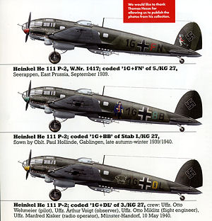 - He 111 P-2; coded ‘1G+DL’ of 3./KG 27, crew: Uffz. Otto Wehmeier (pilot), Uffz. Arthur Voigt (observer), Uffz. Otto Miklitz (flight engineer), Uffz. Manfred Kisker (radio operator); Münster-Handorf, 10 May 1940.