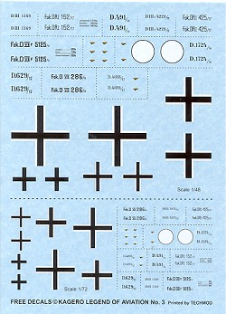 As is expected, there is a decal sheet with this one, covering 10 aircraft in both 1/72 and 1/48 scale. Also given are late war insignia as used on the Fokker D.VIIs. The reason for providing so many aircraft is that the sheet is basically serial numbers. Jasta 11 planes, while very colorful, apparently did not have much in the way of personal markings on their aircraft. There are serials for various Albatros, Pfalz and Fokker aircraft. When looking through the profiles, those with decals to match are clearly marked.