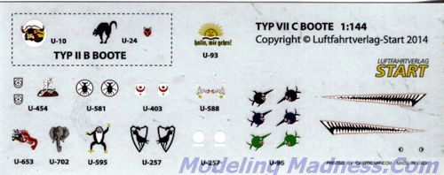 What they have done is to produce a decal sheet that covers some of the art work that has surfaced in the many photos that have been used in the various issues. This particular sheet covers the type VIIc, one of the most widely used submarines of the war. These markings were, for the most part, to be found on the conning tower of the U-boat, though the shark mouth was located on the bow, and is a very unusual place for such art work. These decals are to 1/144 scale and since I only know of the Revell kit in this scale, that is what you'd use.
