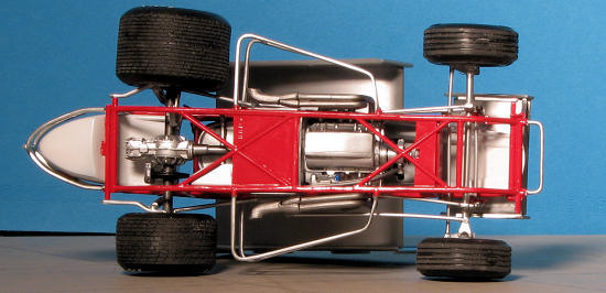 I should talk a bit about the decals. Monogram decals of this period were well printed, thick and somewhat 'plasticy' in appearance. However, despite the glue turning a milky shade once the decals were wet, they went on without any problem and even reacted well to Microsol setting solution. I was so fearful that they'd end up being junk, but that was not the case at all. Not bad for kit decals produced in 1987 and bodes well for other racing car kits of similar vintage in my stash. As you might imagine, many of these markings had to be applied during the build in order to get clear access to where they had to go.