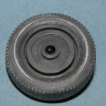 Wheels are next. These are black with chrome hub caps. Now Tamiya wants us all to have nice treads on our tires, though after sanding away the mold seam some of that is lost. So the inner portion of the tire fits about halfway through the tire itself. This not only leaves a seam you won't see from the outside (as planned), but if you want to get rid of the seam by filling, it is now much, much harder to fill and sand. A motor tool and a sharp square tipped knife blade are most helpful in getting out any filler than has gone down against the wheel rim. The brake cover traps a polycap so one can simply press the wheels onto the plastic axles. I should mention at this point that I used Bare Metal Foil Chrome foil when it came time to do the hubcaps as it is much easier than trying to mask around them for painting.