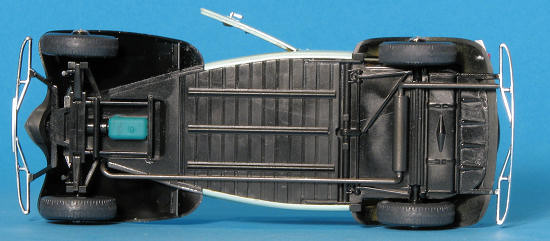 After installing the front seats, the body was glued in place, followed by the grille section. Tamiya provides prominent pins on the chassis section to be sure you get things properly aligned. Then went on the bumpers. Fit here is fairly good, but not perfect. On the underside, I glued on the exhaust system. This left only some fiddly bits. This included the door handles, trunk handles, license plate holder and the windscreen wipers. The instructions show them straight up and down, which is how I installed mine, but they perhaps should be over to one side. I'd move mine, but got some glue under one so that pretty well takes care of that situation. The tail lights were painted white than red. Gas cap glued in place and I glued one door shut by putting a bit on the hinge so that I could change my mind if I wanted. The driver's door was left open. I didn't use the driver. A bit of paint touchup and I was done.