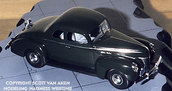 Although this might sound a bit frustrating, it was no more so than many kits I have built. I do not know if it is typical of Lindberg as this is the first car kit I have built from them. When it came time to painting, I didn't know what color to use. I looked through an old issue of Automobile Quarterly, and found several photos of Fords of this era. All were painted in a dark or subdued color with a neutral interior, like beige or grey. I decided on a very dark green exterior and medium grey interior. Since I mostly build aircraft, I chose RLM 70 (black-green) for the exterior and RLM 75 (a darkish grey) for the interior. Both were Gunze acrylic paints thinned with Future floor wax to give it more gloss. After several coats, the interior was flattened with a clear matt, and the exterior got more Future to gloss it up. Naturally, I screwed up the exterior paint with some superglue, but it was patched and looks OK. Why can I not build a kit without at least one screwup??