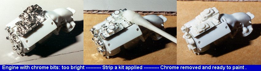 I also used Strip-a-Kit to remove chrome from the wheels, gas cap, valve covers, intake bits and some other smaller pieces. Chrome is nice, but as you can see on the picture of the real car, wasn't used on all these parts. Besides, I was planning on doing a bit of alternative painting for a few of these bits anyway! It is at this stage where a lot of painting started to be done. Unlike aircraft, it seems that car models are in a constant state of being painted.