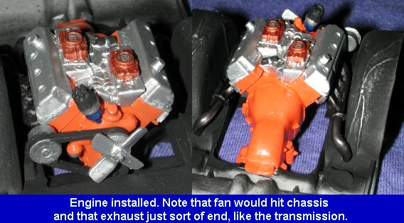 I had a terrible time with the wheels and tires. No matter how I tried, I couldn't get the darn things on straight. Superglue was a disaster and I ended up having to clamp the wheels together while drowning the join in liquid cement. Then the tires weren't on straight. I also split the backs of two wheels getting the slightly too large axles to fit. AAUUGGHH! Who was it that said car kits are easy?? To make matters worse, when it came time to installing the axles and wheels on the chassis, the engine blocked the route of the front axle. This meant breaking the glue join on the engine to allow the axle to pass through it.