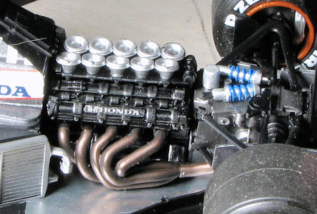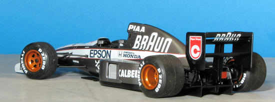 Second, let me comment on the decals. These were attached throughout the final stages of building while the areas on which they fit would be easiest to reach. Though a bit transparent, they generally fit and worked well. Two areas gave me trouble. One was the white sections on the inside and outside of the front wing. These decals generally did everything bad a decal could do in terms of not fitting, or bunching up or wrinkling or not succumbing to setting solutions. Paint these areas white. Don't think about it. Do it. Second area that was a pain were the split Braun decals on the wing. Trim these to within an inch of their lives or the clear sections left over will give you fits. The rest of the markings went on beautifully, though I did have a bit of issue with those going across the engine cover splitting a bit when they were cut. The glue on these is very thick and so the decals will stick almost where they touch. Lubricate the area under them liberally with soapy water or saliva. According to the instructions, the 'powered by Honda' decals on the body stripe are supposed to be at an angle. They look a touch odd so I'd center them were I you. I used Mr Mark Softener on these with no issues other than those aforementioned. Oh yes, I also decided to do Stefano Modena's car as he had the best results with it.