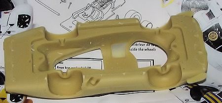 This kit has a full resin body and lower chassis section with the interior molded in. Other resin parts are provided for the instrument panel, wheel inserts and the wing with its supports. Photo etch is used for the windscreen wiper and a pair of small grilles. The headlight covers and windows are vacuform. The delineation of these parts is rather faint and the plastic rather thin so this will need great care to prepare. For the headlight covers, they simply used a Porsche 917 front end as the master, so you get the covers that way. A rather ingenious way of doing things. Two solid steel axles and four wheels and tires are included. The wheels are turned aluminum while the tires are rubber/vinyl. The headlights are self sticking chrome dots. A straight pin is provided for the gear shift and there is a separate steering wheel.