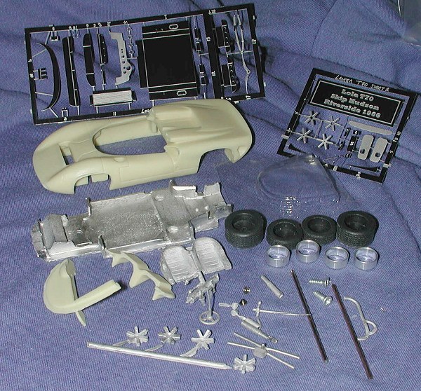 For those of you who have had no experience with short run 1/43 car kits, this one is pretty typical of the genre. Not that long ago, there would have been no resin in it and the body would have also been done in metal. When I went through a stint of building these kinds of kits about 20 years back, that is how they were done. However, the level of detail available in resin has changed things a bit. As you can see, the 'frame' and many other bits such as the roll bar, wheel inserts, seat and such are in pewter. This kit has two frets of etched metal for various inserts and for the cockpit tub, dash and spoilers. In fact, the larger sheet is a generic Lola T-70 offering and not all will be used. The wheels are a combination of turned aluminum, pewter and etched metal. The tires are a single piece and are a hard rubber, so there is no fear of these splitting as time goes along.