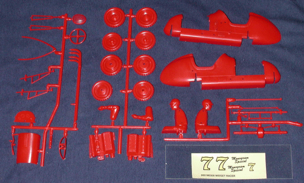 I'm not really sure of the scale, but I'd hazard a guess as to about 1/20th or so. (Turns out this is pretty close. Tom Avenengo wrote me that he has scaled it out to 1/18th. Ed) It really is much larger a kit than one would think. All of the parts are molded in red plastic and it has engraved panel lines! No rubber or clear bits, though a section of clear acetate is provided for you to make the windscreen. It does have a full engine, though detail is a bit basic. No radiator, no drive shaft, just two engine halves and an exhaust pipe. The interior is also a bit lacking. While there is a dash and steering wheel, there is no seat. You are provided with a rather large driver to place instead.