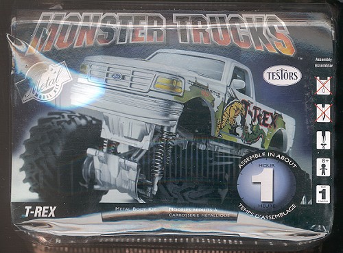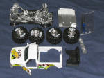Testors kit comes attractively packaged so that you can see most all the bits through the clear package. After opening the blister container, the parts fall out onto the surface and we can get a good look at them. Basically, there are four tire/wheels, a body, the chassis, the interior, the bed and the rear bumper. A small bag contains the two axles, three screws and a screwdriver.