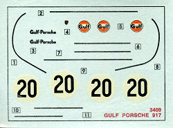 Instructions are the standard style of images and part numbers. There are Humbrol color references though no idea of what the colors actually are is provided. The lone car is Gulf Porsche #20 in the rather nice scheme of Gulf Orange and Gulf Blue. The kit provides the black striping for the demarcation line between the colors, but the two main colors are to be painted on. Normally, one would do this before mounting the body, but since the lower bodywork is separate, this can't be done completely. Decals look to be quite usable on this reissued kit from about 2003 or so.