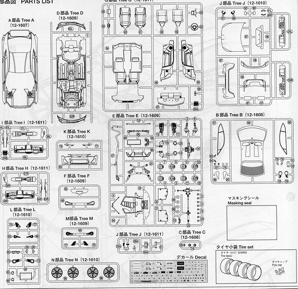 Aoshima provides the builder with masks for the windows and windscreen, something I wish all car kit makers included as they are very handy. Much of the reason for this is that windows are now glued in place at the factory and there is usually a black surround to all the windows to help hide this. There body has separate nose and tail inserts to provide the proper car details for the Japanese or North American version. Tires are rubber/vinyl and are handed so be sure to pay attention to this during your build.