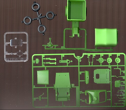 On one side of the instructions is a listing of all 23 1/32 Japanese cars (wait, one is a Porsche 911 and another is a VW), that are in the series. If you read the preview of the Honda 600 sports car done a bit back, you'll find that one on the list, along with a lot of cars you've never heard of much less seen unless you've lived in Japan during the 60s. The other side of the instructions gives the few construction steps needed. Of course, everything is in Japanese, but at least it seems they use Gunze paint references, so most of us won't have any real trouble in that area. A small decal sheet is provided that has plates and some names for the side of the canvas bed cover.