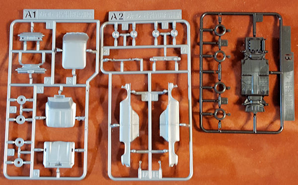 There are three sprues, two in grey plastic and one in black. No clear parts are included nor is there an interior, which I guess is fine for this scale. There are also no chrome parts.
