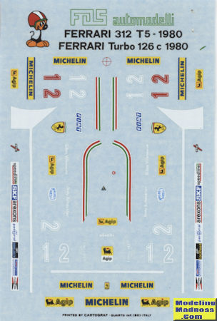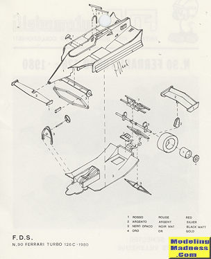 Instructions are an exploded diagram with basic painting information in Italian, French, and English. This is fairly typical of these kits from this time frame. Newer kits usually have a lot of photo etch so their instructions are more complex. I am not sure just which race this is supposed to be for, but the box has 1980 printed on it so it may well be the prototype or even the early 1981 season car for the two drivers that year, Jody Schecter and Gilles Villeneuve. Surprisingly, the decal sheet is in quite good condition and printed by a then relatively unknown company called Cartograf. You'll also note that this sheet is for two different cars.