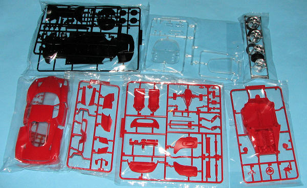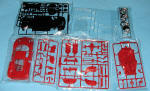 The one piece body is superbly molded in red (though many will choose to paint it anyway). There are two sprues of plated parts. One is for the aluminum wheels and the other is for various interior parts and the exhaust tips. Vinyl or rubber is used for the tires.