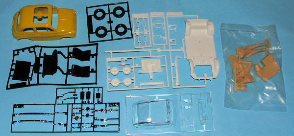 The figures are very well molded in resin and should not be a problem when assembling. Vinyl is included for the tires, seats, and the sun-roof. The chrome plating is very well done and you get metal axles. The single sprue of white plastic for the majority of the kit are well molded and free from the usual glitches. There is no engine with this one which begs the price of the kit and the fact that one of the features of this car in the movie is the hopped up engine of the car in several chase scenes. The one-piece body is molded in yellow (to preclude painting, no doubt). The large clear sprue includes the dash where one is supposed to paint ivory aside from the location of the lone instrument. One thing I would have liked to have seen included was the Boys anti-tank rifle that was the weapon of choice of the guy in black.