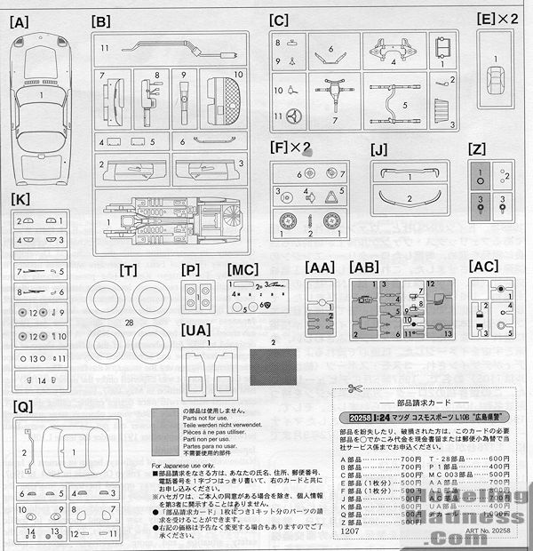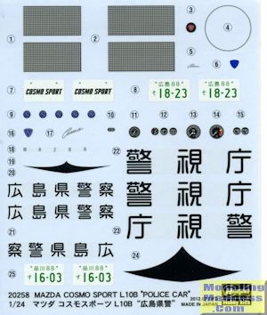 Instructions are excellent and provide all the required painting information as well as templates for the various bit. There are markings for two vehicles. One is a car for the Ministry of Transportation and Highway Traffic police, Hiroshima Prefectural Police. The other is for the Metropolitan Police Department riot police traffic direction. Yeah, I'm not really sure what all the means either. In any case, the decal sheet, which not only provides instrument panel decals, has all the various police logos as well as the forward hood wedge, which is a different size on the two cars. You can paint this one any color as long as it is black and white.