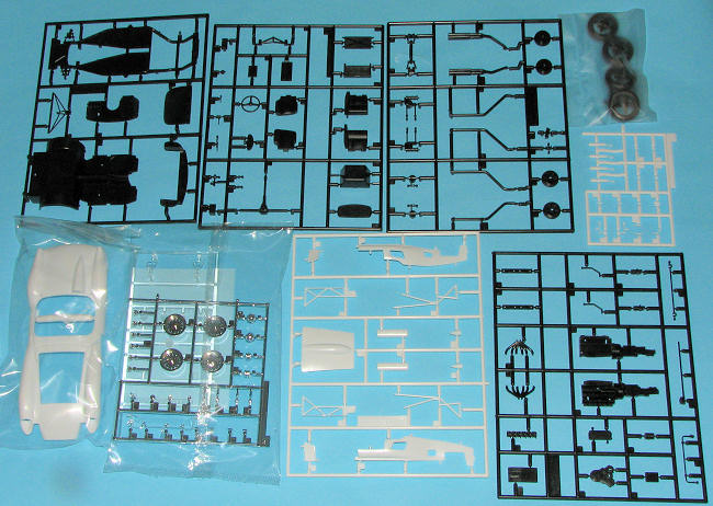 The kit is not a curbside and comes with a complete engine, transmission and drive line. The molding on the parts is superb. Hasegawa seems to have gone to lengths to keep those pesky ejector pin marks from being a problem. From what I can see, any that are extant will be covered by other parts or invisible after construction. The kit also provides the ability to display the hood open and has steerable front wheels.