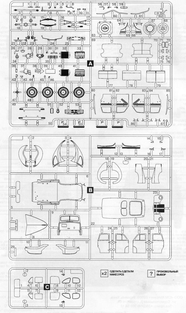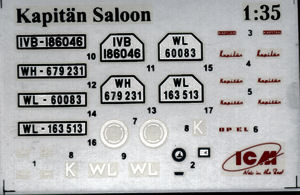 Markings are for four cars. One is a civilian vehicle in gloss black from 1940. Next is a white one from Russia in 1942. A panzer grey version from Russia in 1943 is the third option while the fourth is from Italy in 1943. This last one is the box art car. While the instructions say panzer grey and green splotches, I think the box art is closer to how it should be. The decal sheet provides license plates and stencils when needed. I have darkened the sheet image so the white parts will be more visible.