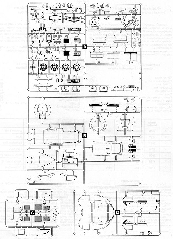 ICM's Kapitan is a well detailed kit that includes not only a full engine, but also a highly accurate chassis and interior. Building the six cylinder engine takes up the first part of construction. The kit has a full chassis that fits under a body that is constructed from a rather large number of components. For instance, there is a flat floor onto which both inner and outer fender panels are attached. The front cowl piece includes the windscreen area. Up front, both inner and outer fenders are separate constructs. The hood area is built up of two sides and an upper section onto which the front piece with the grille and headlights is attached.