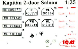 Markings are for four cars. One is a gloss black vehicle from 1940. Next is one in overall panzer grey, also from 1940. There is one from Libya in 1942 in panzer brown with large grey stripes in a random pattern over the car. Finally, in panzer yellow with green mottles all over it is one from France in the summer of 1944. The decal sheet provides license plates and stencils when needed. ICM has been using white backed decal paper, making seeing the white markings quite difficult.