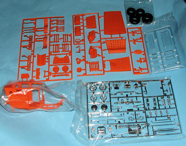 The kit itself is molded in orange plastic, undoubtedly to facilitate painting. The instructions hawk a 'New and Improved' chicken for the roof cage and that really adds to the value....... The parts, are, as you might expect, very nicely molded and flash free. The chrome sprue is particularly well done and those building this kit will need to be careful about removing parts to minimize damage to the chrome. It will be inevitable that some parts will need touch-up and for that, the easiest fix would be chrome foil of some sort.