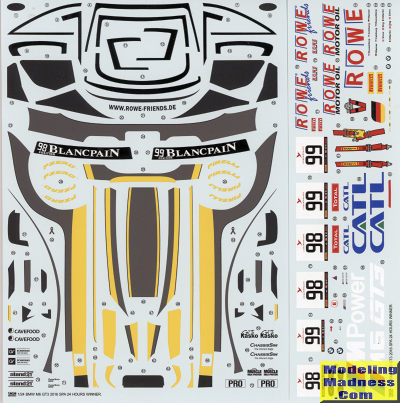Instructions are superbly done with the usual Gunze and Model Master painting references. Markings are for two nearly identical cars that differ only by number and a few other decals. As is becoming the norm with racing car kits, the fancy paint work is provided as a decal. Basically, you paint the body and interior white and go from there. The chassis and lower body pan are in basic black. Wheels and some suspension parts are a metallic black so no need to be concerned about painting them aluminum or other shade. The decals look to be superb and it is nice that they included a seat harness decal. For those interested. NuNu Hobby has done an upgrade set that includes photo etch parts, cloth belts, metal valve stems and radio antenna mount, and carbon fiber decals.