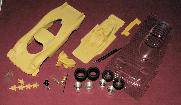 This kit has a full resin body and lower chassis section with the interior molded in. Other resin parts are provided for the instrument panel, wheel inserts and the wing with its supports. Photo etch is used for the windscreen wiper and a pair of small grilles. The headlight covers and windows are vacuform. The delineation of these parts is rather faint and the plastic rather thin so this will need great care to prepare. Two solid steel axles and four wheels and tires are included. The wheels are turned aluminum while the tires are rubber/vinyl. The headlights are self sticking chrome dots. A straight pin is provided for the gear shift and there is a separate steering wheel. The clear bits are vacuformed. For the headlight covers, they simply used a Porsche 917 front end as the master, so you get the covers that way. A rather ingenious way of doing things.