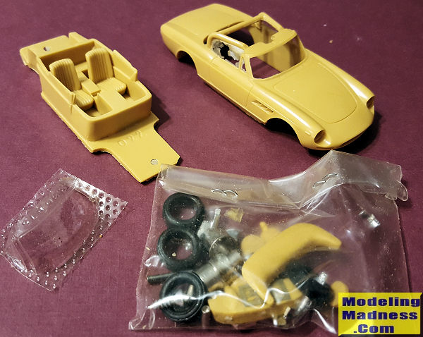 The major components are in resin, it comes with metal wheels and detail bits, rubber tires and a vacuform windscreen. I have left all the small pieces in the bag to keep from losing them. Unusually, this kit came without any instructions. Normally they are included, but perhaps that is why this and the others I bought were so inexpensive.