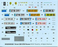 As usual from Revell, the instructions are superbly printed with 8 construction steps. Colors are provided as generic listings (this is not a Revell AG boxing), so one can paint as one goes, which is the norm for cars. No overall shade is recommended, but we all know Ferraris are supposed to be red. An interesting note is that there are specific decals for US and European vehicles. IOne is supposed to cut out the license plate decals and paste them on with white glue, thought the rest can be applied as normal water-slide markings.