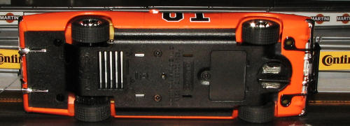 The chassis is quite reminiscent of that which is under the new Scalextric Camaro, though it is longer. The same tires fit this one and once the photos were taken, the magnet was removed, a bit of weight added to the front and the rear tires replaced with Maxx Trax M9s. The car is a bit more 'tippy' than the Camaro, but turns pretty close lap times on my Scalextric Sport track. Perhaps more weight will help the handling, or perhaps just changing my driving style will help. Either way, there is room for improvement.