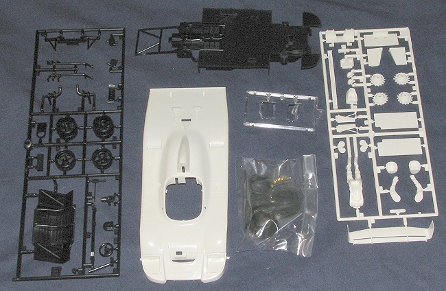 This is part of their Sports Car series; #12 in fact. The kit is a curbside, which means that there is no engine. The bottom part of the engine/transmission is molded onto the floor pan and this snaps in place under the body. You see, it is designed to be motorized and where the plastic engine would fit is taken up by mounts for the electric motor and its batteries.