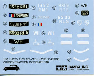 The car has five options. One is a German staff car in overall Panzer Grey. Next is a French staff car in overall olive green. An all black civilian version is next with the last version also being civilian. This one is light blue with black fenders and can be built as one that has been commandeered with German plates. The decal sheet is nicely done and includes the white fender edge markings for the German staff car.