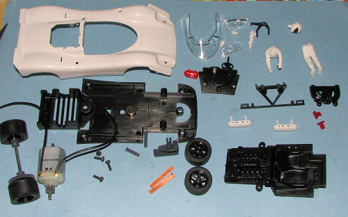 In addition to ready to run cars that are already painted, Fly has often offered kits. Some are prepainted and other, like this one, are 'white' kits. The body is prepainted white and the builder then paints it. All the rest of the parts are unpainted as well, requiring the builder to use his skills. From my experience in returning to the hobby for a couple of years, most slot car people are pretty clueless when it comes to painting skills, so these kits sell fairly well, but don't zoom off the shelves, so to speak. Most of the hobby is through mail order from various on-line shops and those few brick and mortar stores around. In the St. Louis area, there are two places to go and buy slot car stuff. Both are a long drive for me and carry only a limited number of items; mostly complete racing sets.