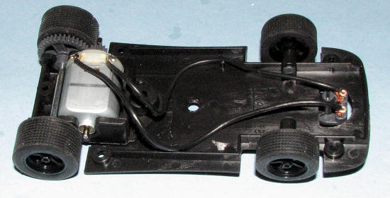 Using the four screws, I screwed the body in place and was done. Test running showed the usual glitches, including the fact that the rear axle gear wasn't put on all the way, allowing the knurled area to slide into the rear bearings, locking up the rear. I removed the wheels and gear, reversing the way the gear was installed and pushing back on the rear wheels. This cured that problem, but I fully expect to have to replace the rear axle assembly with aftermarket in the near future as this area is a weak one for Fly.