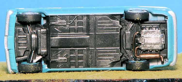 Initially, all the parts were painted on the sprue, then removed, the sprue attachment point cleaned up and the part then repainted. I also painted the tires with NATO black along with the chassis piece. This latter item was drybrushed to help bring out some detail using Vallejo aluminum. This shade was used on the engine and the exhaust was painted Tinny Tin. When I painted the body, I also painted the back section of the wheels and the hub caps. The hub caps (actually wheel covers) were then painted polished aluminum from the Alclad II range, as were the mirrors.