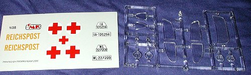 The decals are for two different versions. One is for an ambulance and is mostly red crosses on a white circle. The other is for a mail truck. Surely, both of these vehicles would be a welcome sight to any battle area!